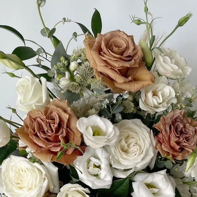Elevate your holiday celebrations with a stunning festive floral arrangement featuring a mix of Caramels and Fresh Whites accompanied by lush winter greens– including fresh Toffee roses, playa blanca roses, velvety magnolia, pinecones, lisianthus, spray roses, and carnations, beautifully nestled in lush winter greenery.